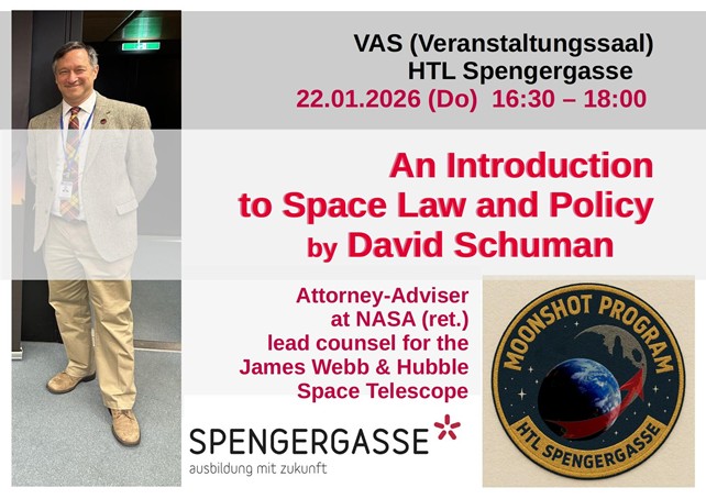 Die HTL Spengergasse hatte letzte Woche die außergewöhnliche Ehre, einen wahrhaft weltraumigen Gast begrüßen zu dürfen: David Schuman, ehemaliger leitender Rechtsberater der NASA, der sein faszinierendes Wissen unter dem Titel „Back to the Moon and Beyond: An Introduction to United States Space Law and Policy“ mit uns teilte. Der Vortragsraum war gefüllt mit einer spürbaren Energie – der Energie der Neugierde und der Begeisterung für die finalen Grenzen.